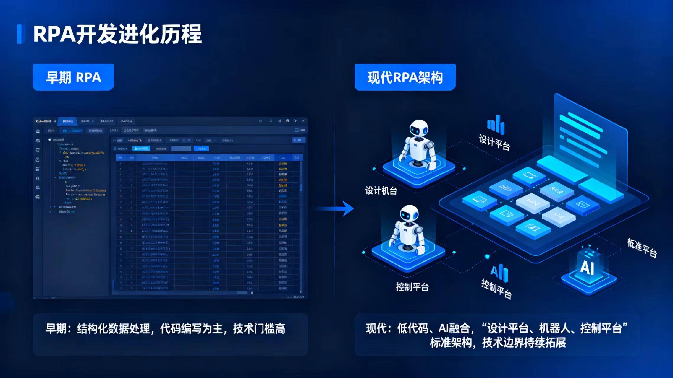 RPA开发经历了从简单流程模拟到智能决策的进化。早期聚焦结构化数据处理,开发模式以代码编写为主,技术门槛高;随着低代码、AI技术融合,现代RPA已形成“设计平台、机器人、控制平台”的标准架构,技术边界持续拓展。