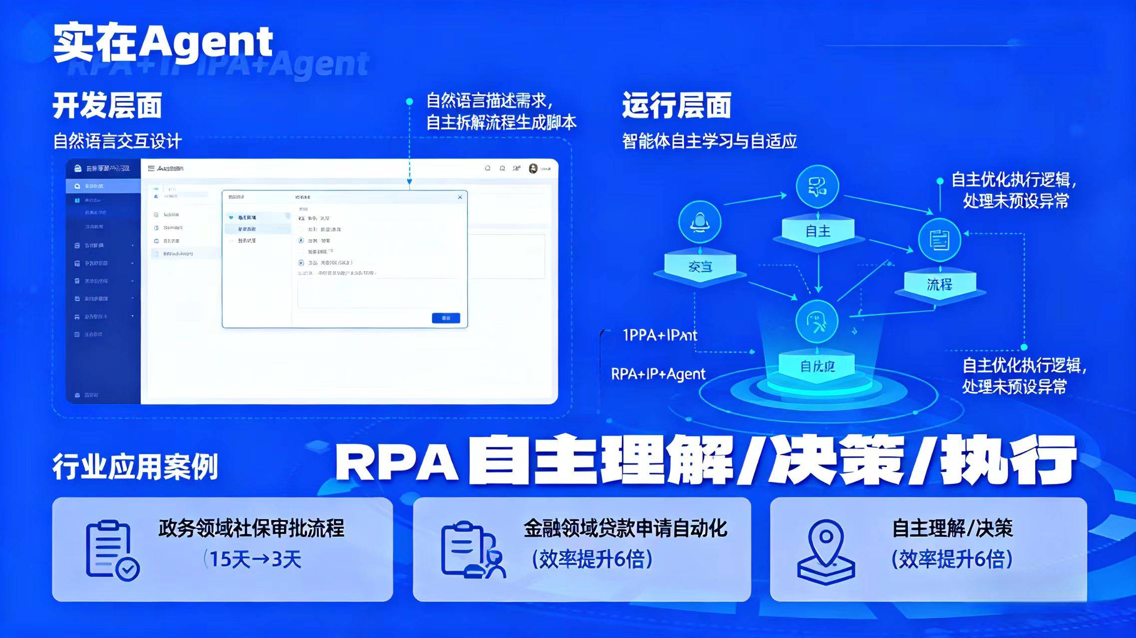 行业应用中,实在Agent适配性广泛:政务领域,某地区社保部门通过其实现社保审批自动化,申报材料自动识别、校验与结果推送,群众等待时间从15天缩至3天;金融领域,助力银行实现贷款申请全流程自动化,效率提升6倍,同时通过智能风险识别降低不良贷款率。实在智能首创的“RPA+IPA+Agent”融合平台,让RPA开发从“流程自动化”升级为“智能解决方案”,创造更深层次价值。