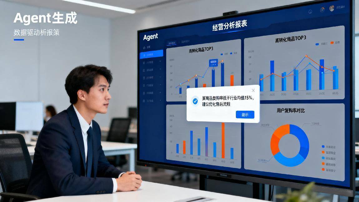 数据分析与经营决策场景,为企业提供战略支撑。Agent可自动汇总各平台的销售数据、用户行为数据,生成可视化报表,识别“高转化商品、高价值用户群体、低效营销渠道”等关键信息。实在Agent的经营分析模块,还能对比行业基准数据,为企业提供优化建议,如“某商品的复购率低于行业均值15%,建议优化售后跟进流程”,帮助企业精准找到增长突破口。