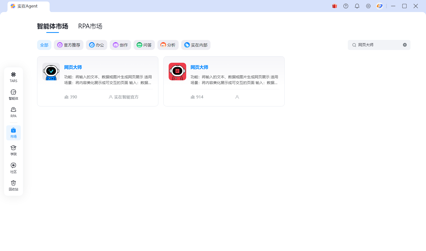 1、在市场中找到网页大师智能体,选择对话;