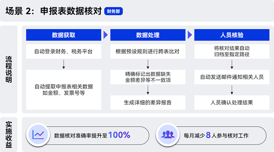 申报表数据核对是企业财务与税务工作中的重要环节,人工核对不仅耗费大量人力,还容易出现错误。南电科技借助实在Agent实现了申报表数据核对的自动化。数字员工自动提取多系统数据,依托预设规则进行跨表毫秒级智能比对,精准锁定差异、自动生成报告,并完成归档与通知。自动化流程实现每月节省8人参与核对工作,人工误差风险归零,为企业的合规运营和精准决策筑牢数据基石