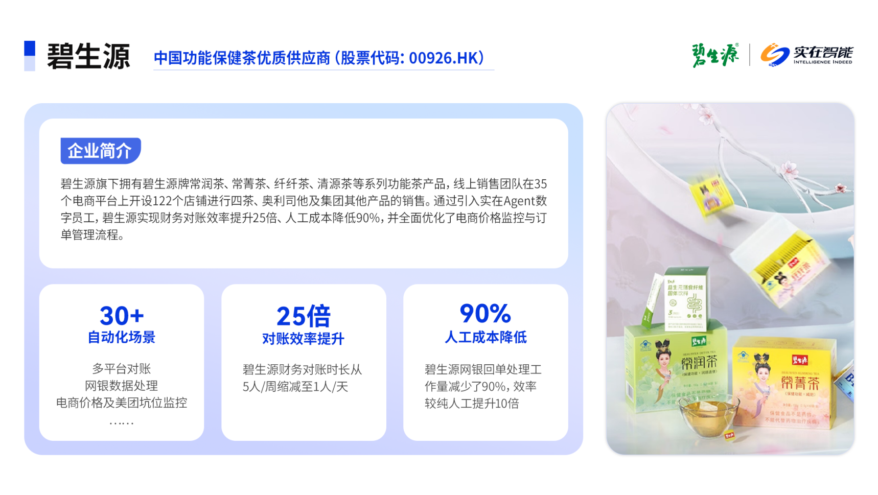 碧生源(股票代码:00926.HK)是中国功能保健茶领域的优质供应商,旗下拥有碧生源牌常润茶、常菁茶等知名品牌。随着业务版图持续扩张,企业在财务对账、电商运营等核心场景中,面临120+线上店铺、14个电商渠道、147个银行账户的数据整合难题,人工操作效率低下的问题愈发凸显。通过引入实在Agent数字员工,碧生源实现财务对账效率提升25倍、人工成本降低90%,并全面优化电商价格监控与订单管理流程,以自动化能力破解电商业务痛点。