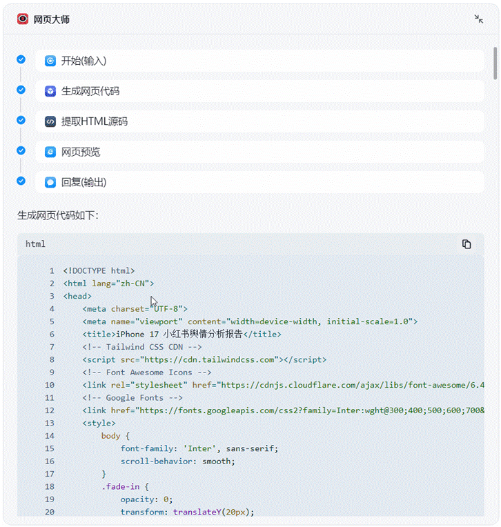 「深度规划」可以根据文字版报告生成对应的前端代码,将报告转为可视化网页,提供更直观、精美的呈现效果。