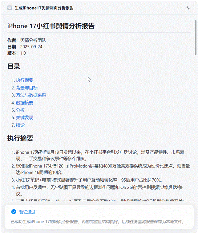 比如,在上述“小红书获取iPhone 17舆情”场景中,实在Agent会将获取结果保存为本地表格作为原始数据,再进行文字与图片的整理分析,输出文字版舆情报告。