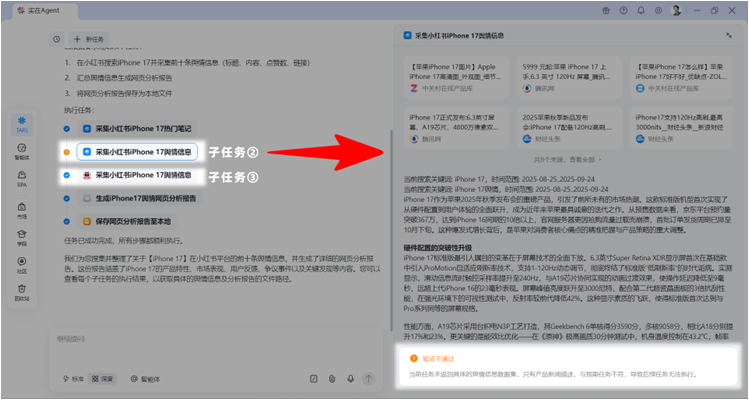 在经过多次测试后,实在Agent终于出现了一次“幻觉”:子任务②获取到的舆情数据源不对,导致后续任务无法执行,实在Agent通过自我验证发现问题,并自动规划了子任务③。