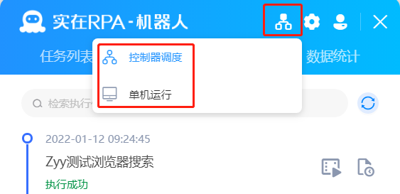 点击右上角的“模式切换”图标,支持两种模式的切换:控制器调度、单机运行。