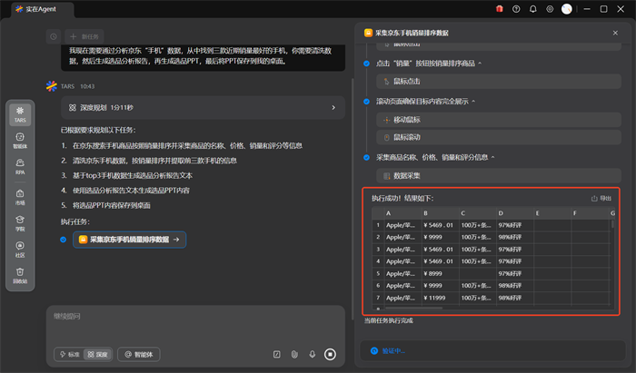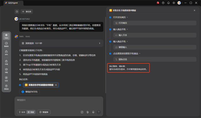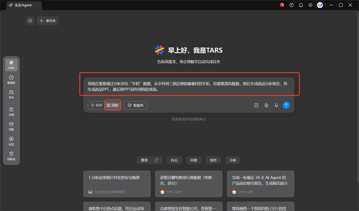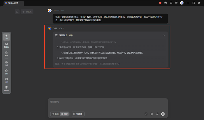 1、打开实在Agent客户端后,选择深度规划,然后输入需求,这里输入的需求是“我现在需要通过分析京东“手机”数据,从中找到三款近期销量最好的手机,你需要清洗数据,然后生成选品分析报告,再生成选品PPT,最后将PPT保存到我的桌面。”;