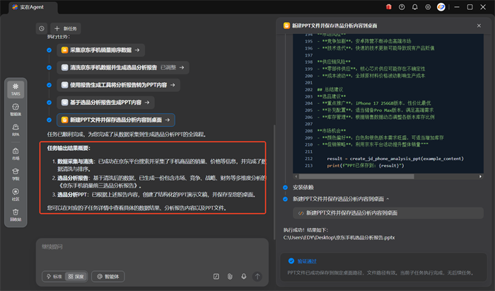 在真实场景测试中,给实在Agent一句话,它就能自动采集电商平台信息,清洗数据,生成PPT,然后通过钉钉发送给对应的负责人。