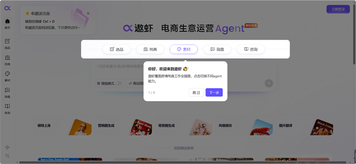 跟实在Agent一样,它也是可以免费试用的,不管是想要选品、找厂商、做素材、找询盘或者咨询问题,都能满足电商人的需求。