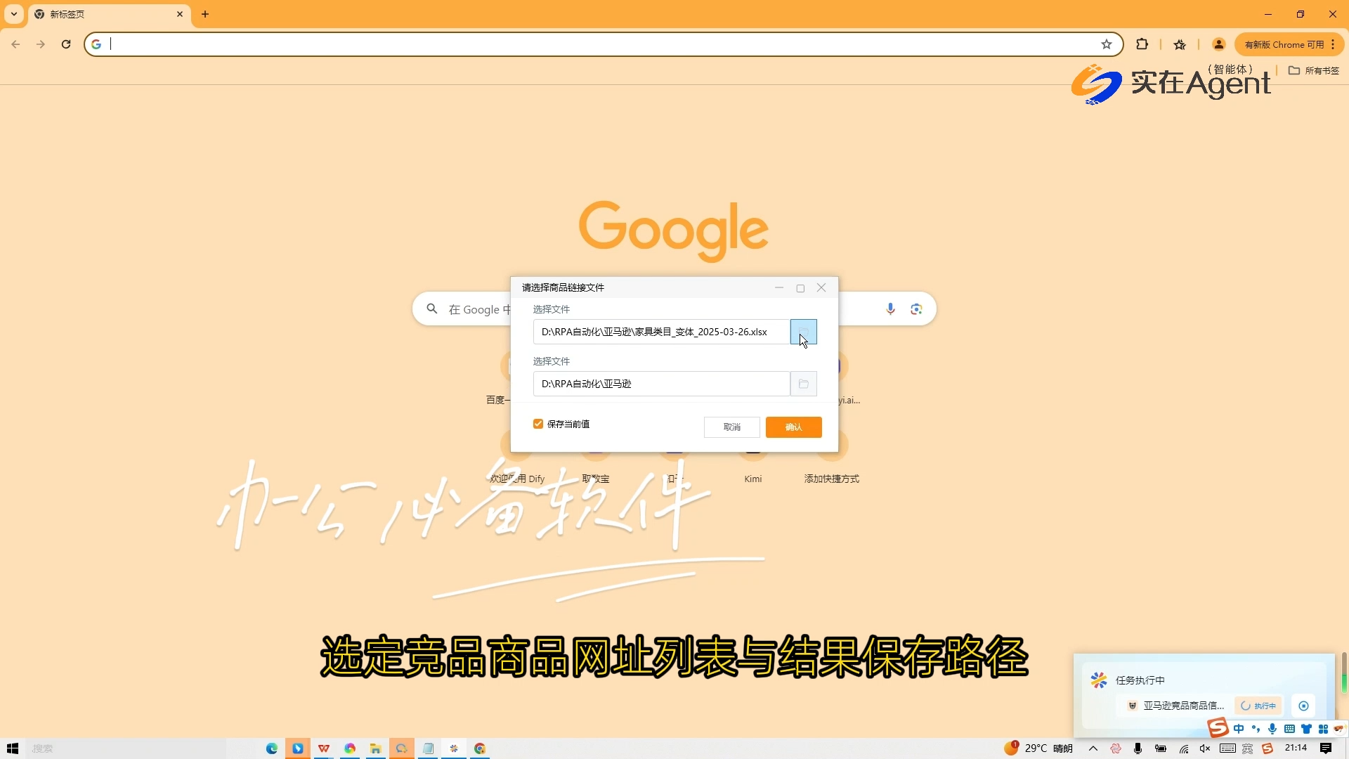 2、输入提前设定好的启用智能体关键词,它就会自动开始执行任务,本智能体需要首先选择好要采集的商品网址列表以及采集出来的数据保存路径;