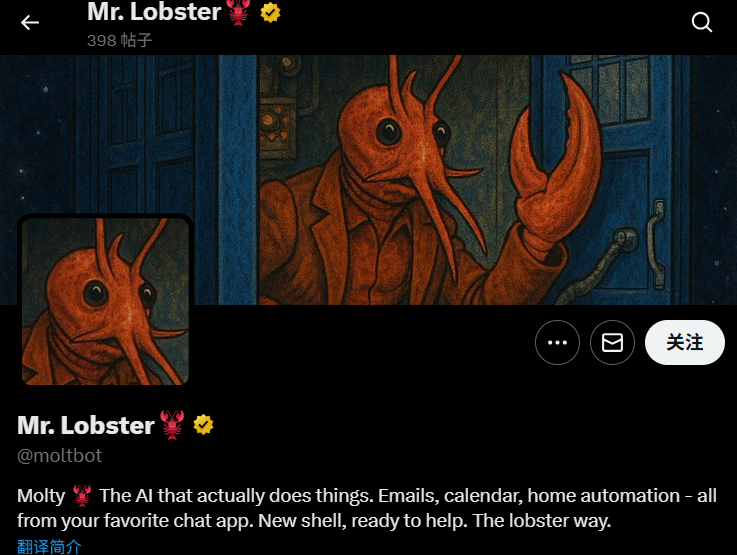 可以看到Clawdbot创始人已经将形象改成了像它背景中外星人龙虾的形象。