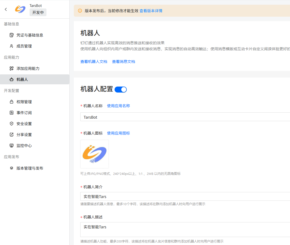 在钉钉后台开启机器人,消息接收模式选择 Stream 模式。