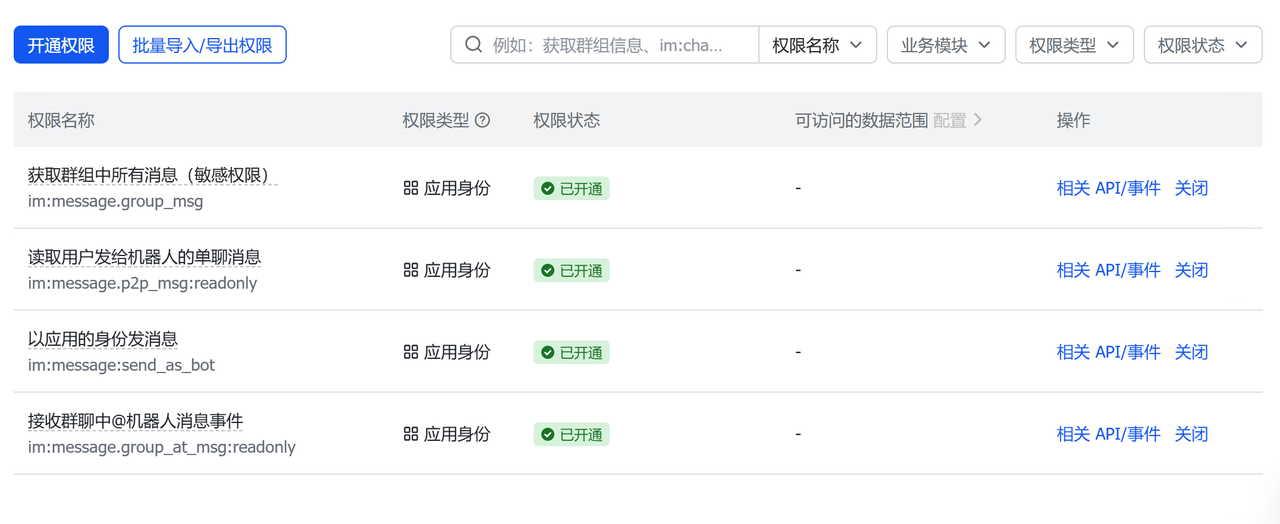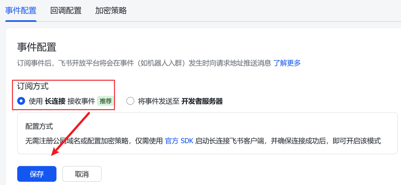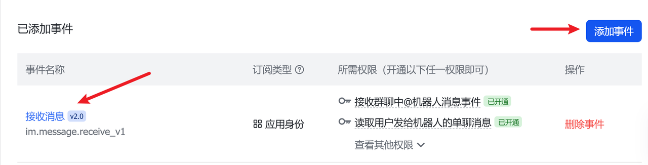 事件配置:选择“使用长连接接收事件”,添加“接收消息”事件。
