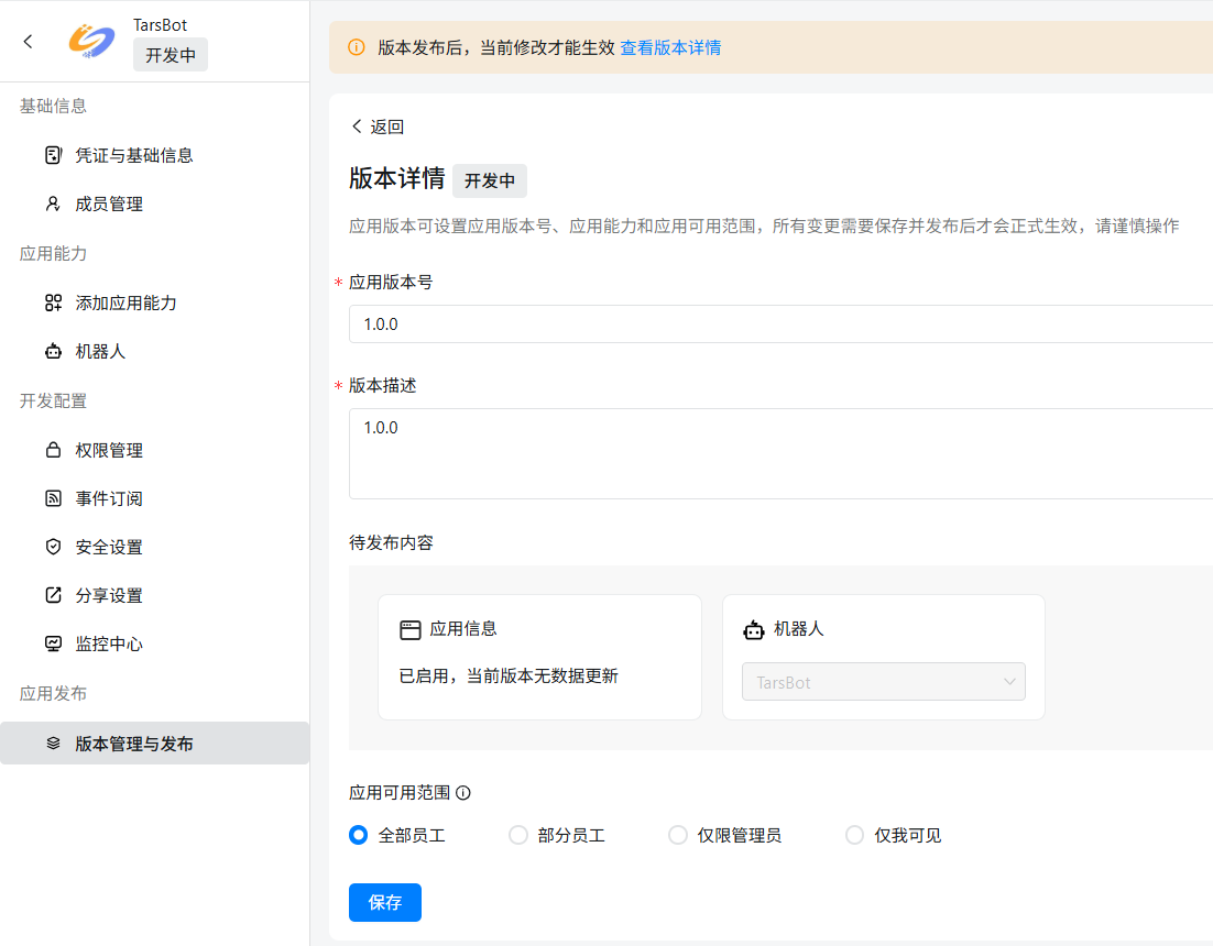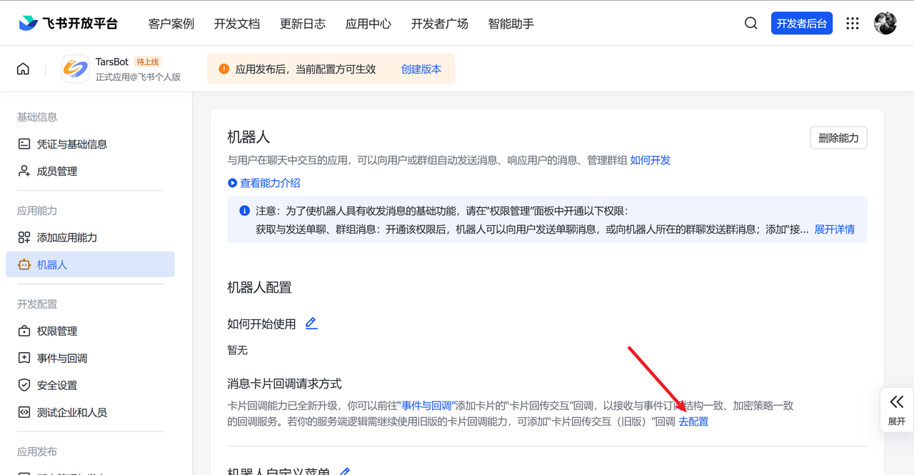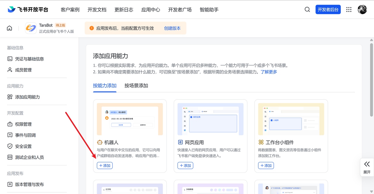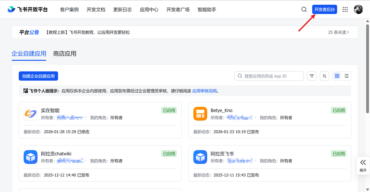 1.创建应用:登录飞书开放平台,创建“企业自建应用”。