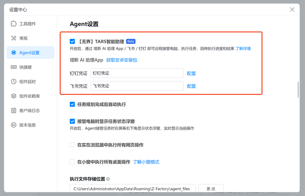 3.绑定 Agent:回到实在 Agent 设置页,点击“飞书凭证配置”,填入上述信息。