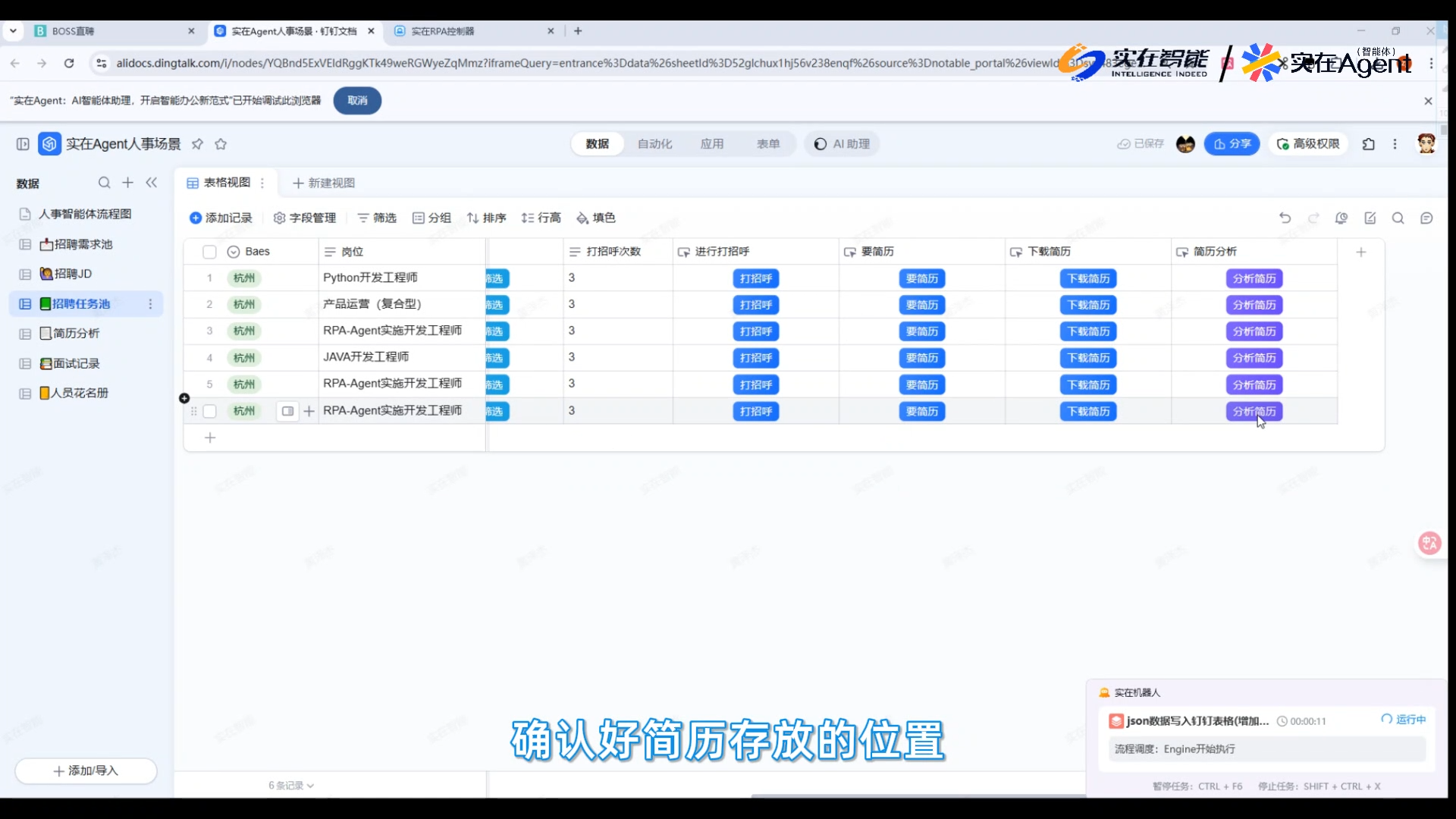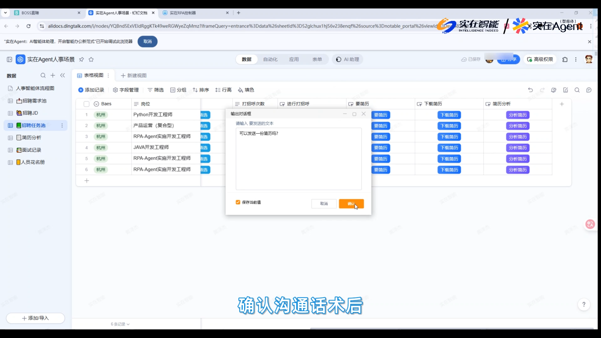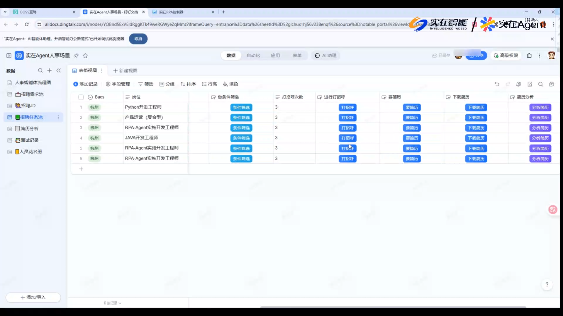 前提条件:本方案是采用钉钉AI表格+实在Agent智能体,在实在Agent上搭建好招聘智能体,HR只需要在钉钉AI表格里面部署对应的AI功能,就能实现自动化招聘。