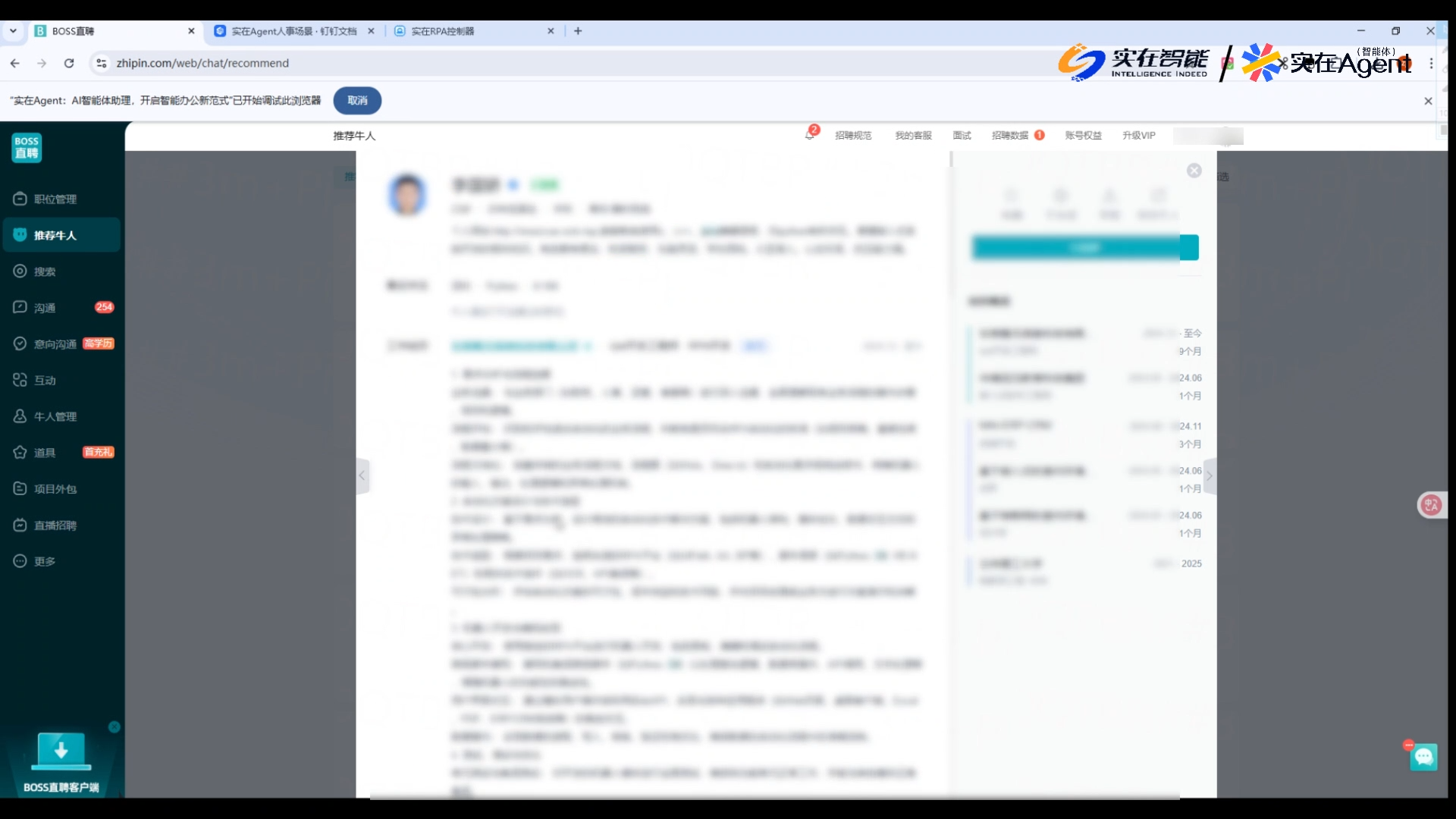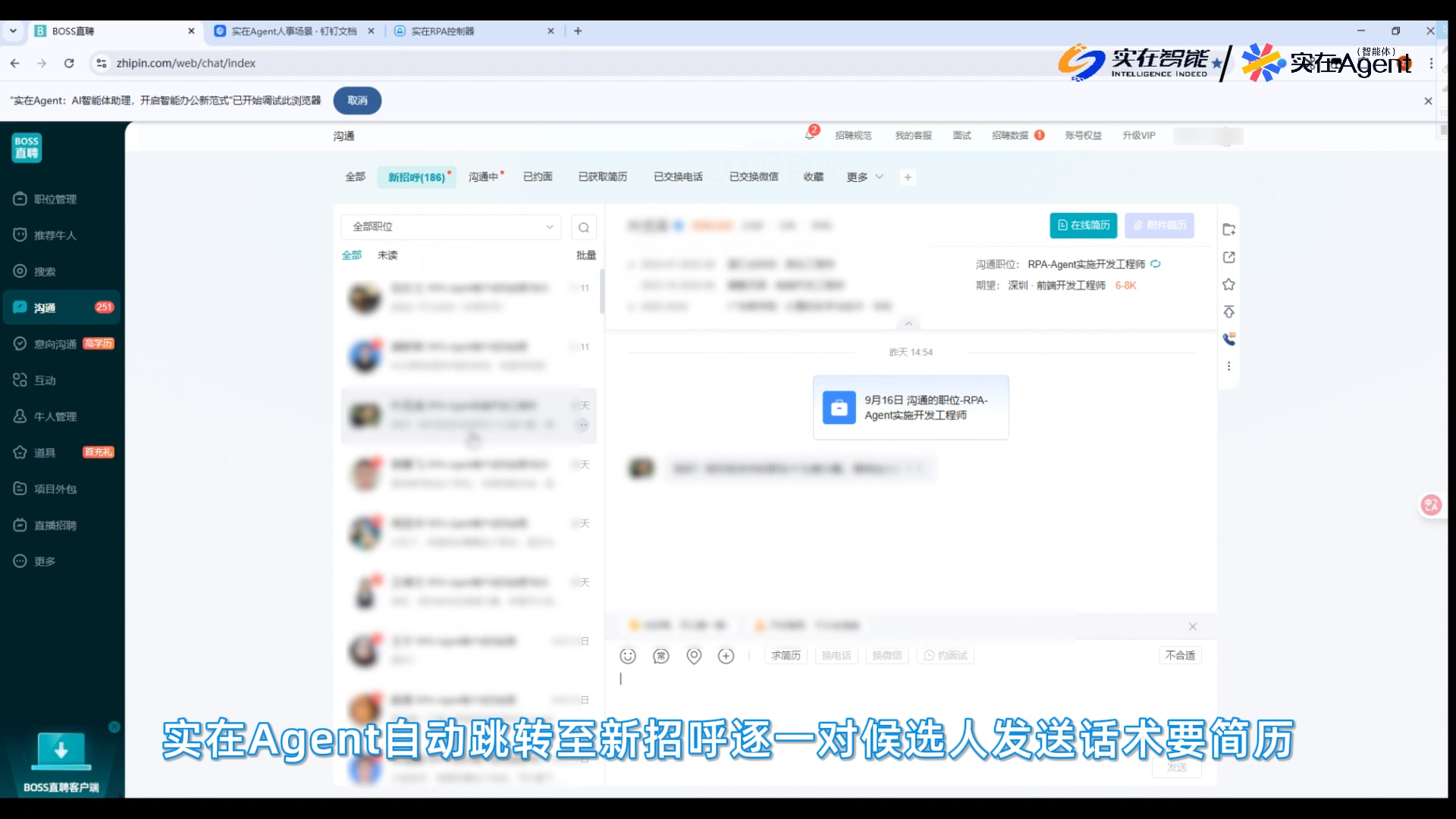 7、实在Agent会自动打开BOSS直聘上的候选人逐一进行打招呼,根据设定好的打招呼数量进行自动化操作;