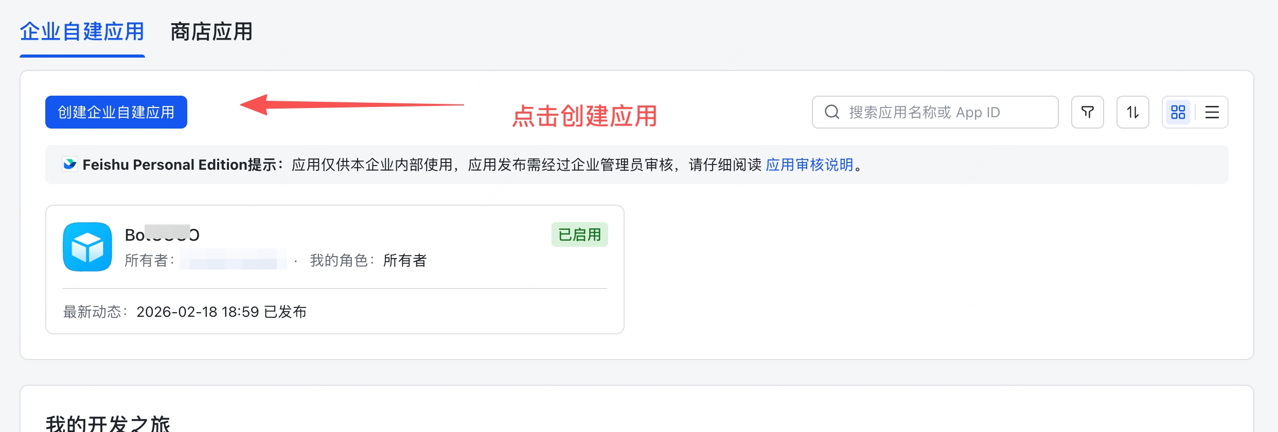 1、打开飞书开发者后台,创建企业自建应用;
