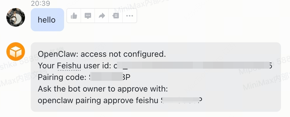 8、这时候飞书机器人应用已经被找到,开始对话,第一次对话会弹出验证码,在MaxClaw对话中发送匹配码完成配置;