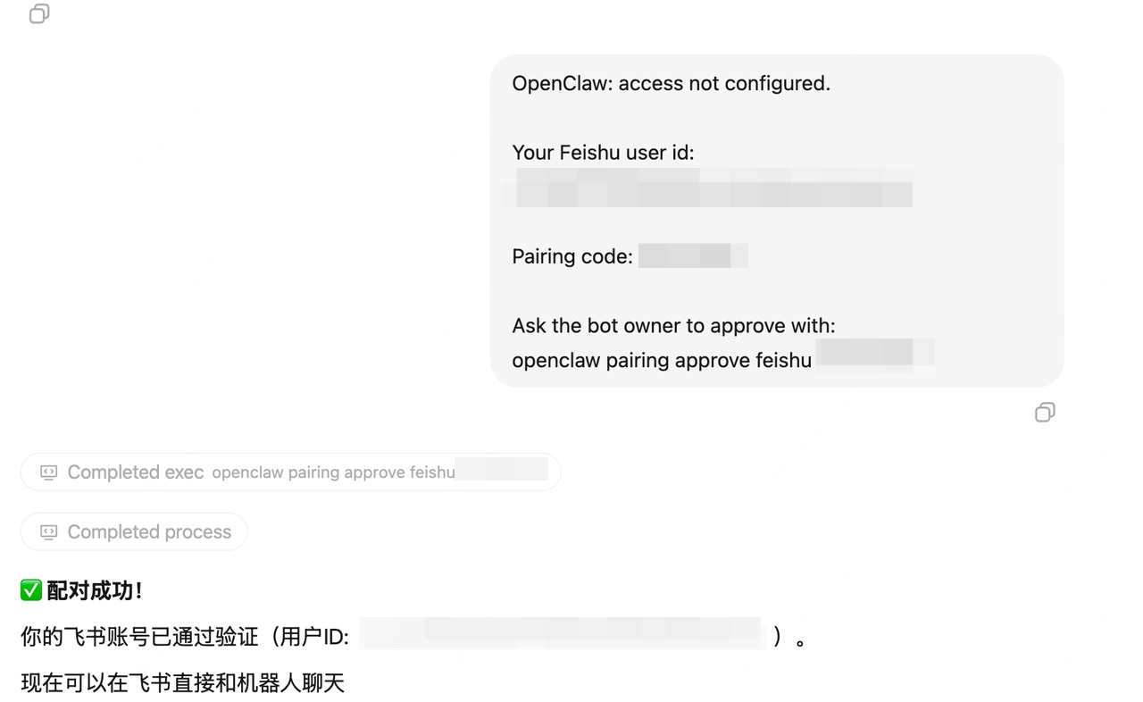 4、MaxClaw对话中,直接将AppID和AppSecret发送给它,并要求配置飞书,直到配置完成;