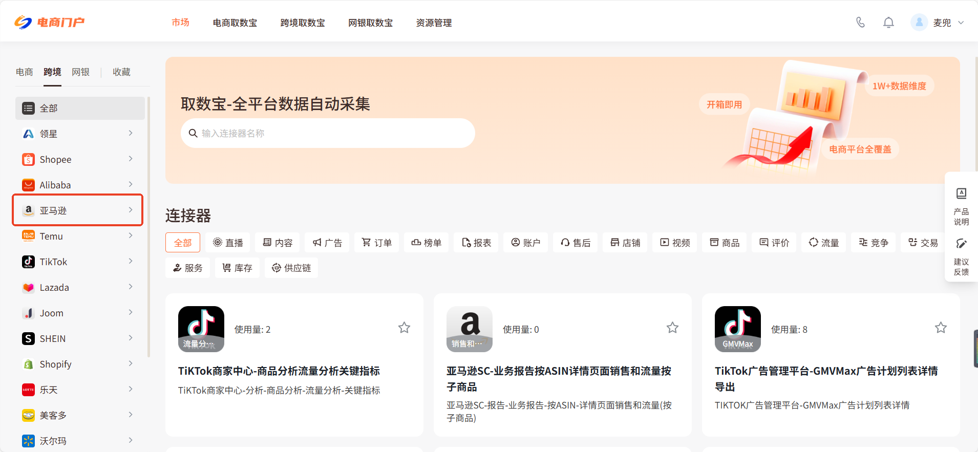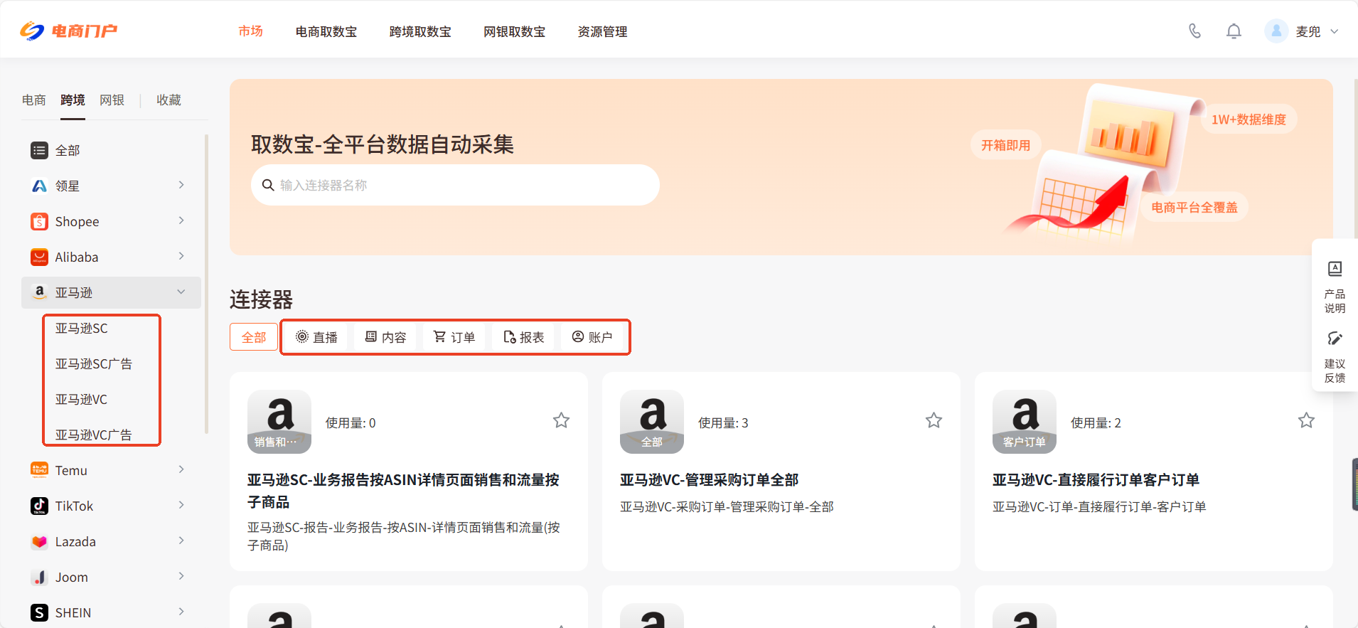 4、亚马逊采集分为SC广告、VC广告等不同的后台,能根据直播、内容、订单、报表、账户等信息进行筛选,还能在上方的搜索框输入连接器名称,快速选择需要采集的场景;