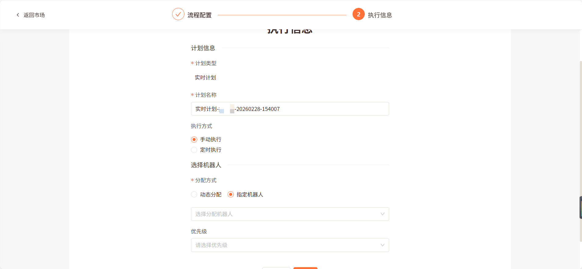 8、在执行信息中,可以选择手动执行/定时执行两种方式,也可以动态分配或者指定某个机器人进行采集,以及设定采集优先级;