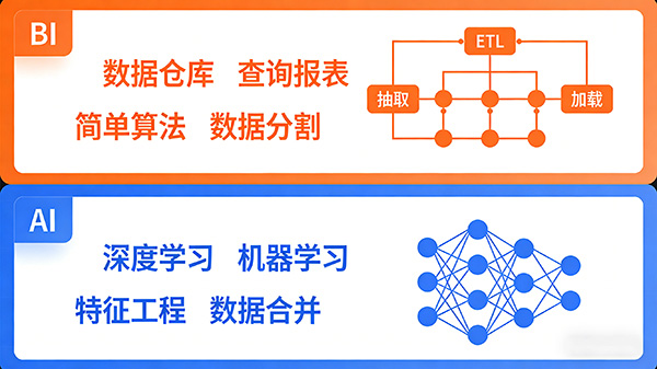 综上所述,BI和AI在定义、技术特点、应用场景、决策支持方式、数据处理能力和未来趋势等方面存在显著的区别。