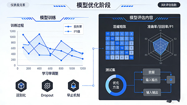 优化:在训练过程中,通过调整模型参数和学习率等超参数,以及使用正则化、Dropout等方法防止过拟合,提高模型的性能。