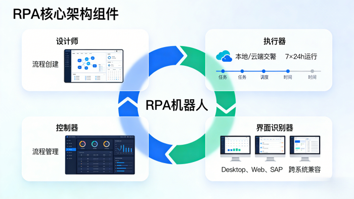 控制器(管理中心):用于监控和管理RPA流程的执行情况,包括启动、停止、调度、日志记录等功能。