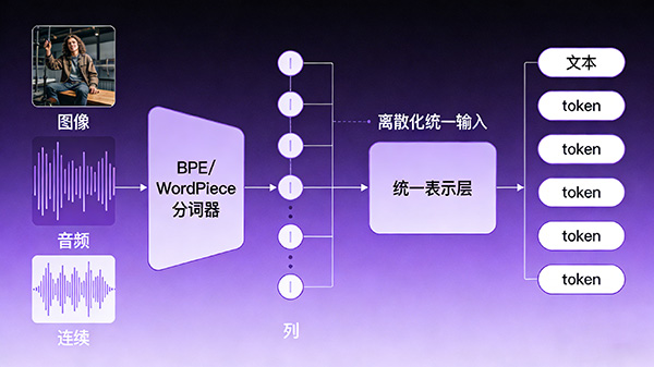 特点:在模型的输入阶段,引入分词器(如BPE、WordPiece等),将图像、音频等连续信号转换为离散的token序列,实现与文本模态的统一表示。