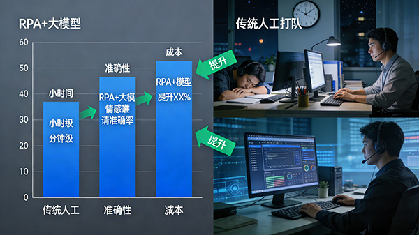 效率提升: 传统人工处理需数小时甚至数天完成的任务,RPA+大模型可在几分钟内完成,且支持7×24小时不间断运行。