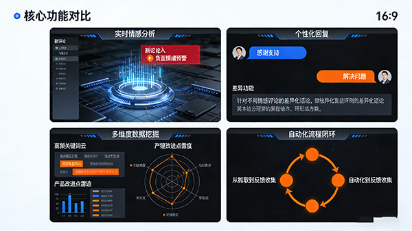 通过自动化情感分析、智能回复生成和数据挖掘,企业可快速响应用户反馈,提升用户体验,同时为产品优化和运营决策提供数据支持。