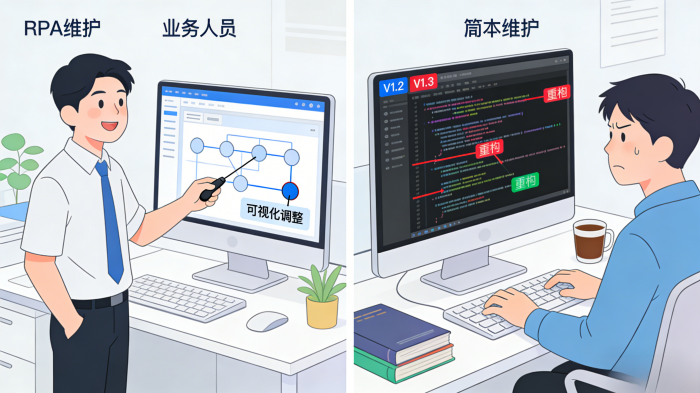 脚本自动化虽然灵活,但代码通常只有开发人员能看懂,一旦开发者离职或业务流程发生变化,脚本就可能无法使用,需要重新编写。