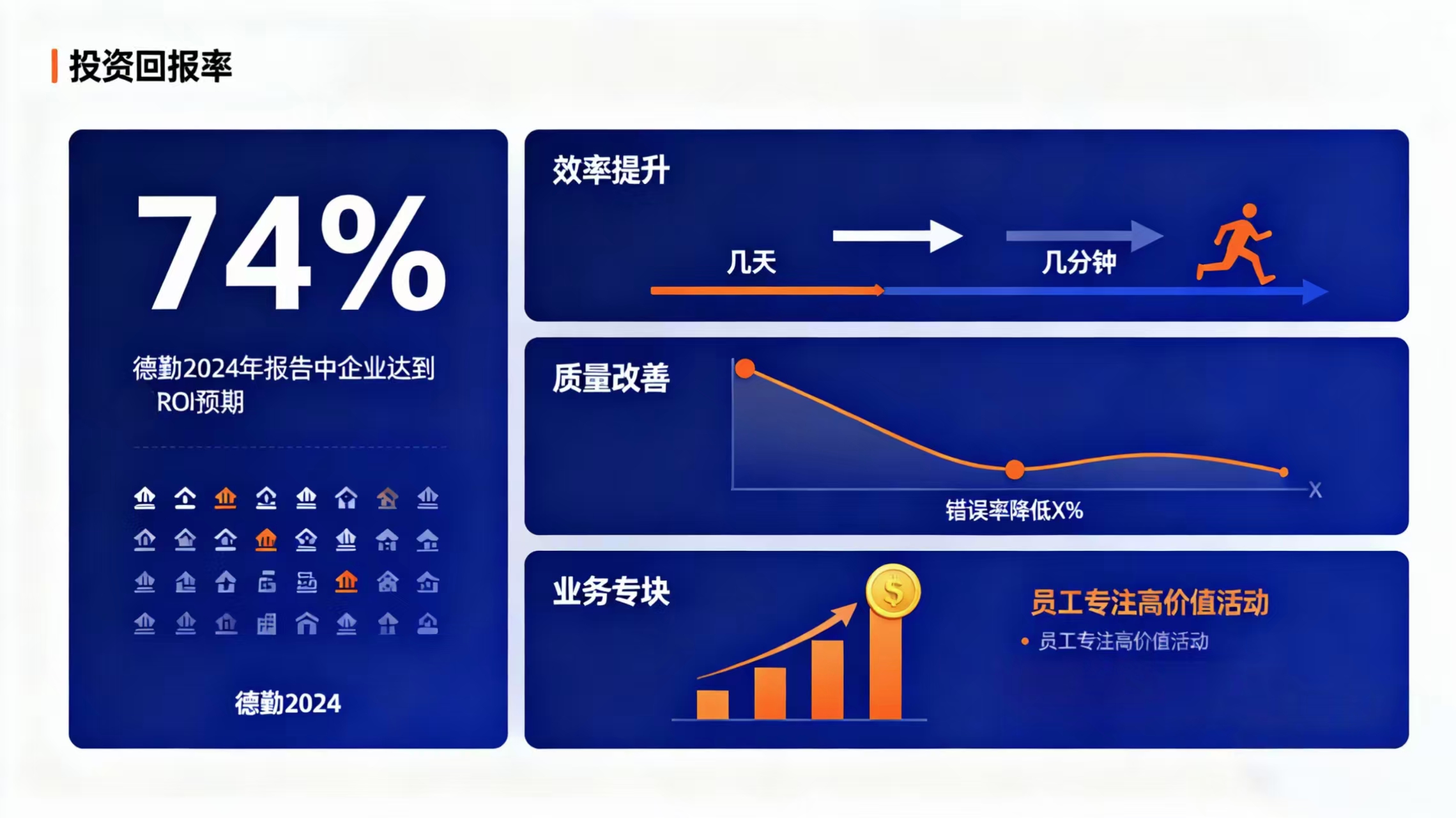 ③业务增收: 将员工从重复劳动中解放出来,让他们能更专注于客户关系、市场策略等高价值活动,从而带来的收入增长。