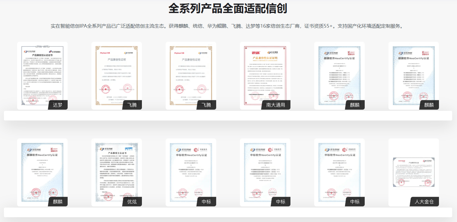 信创产业作为国家重点发展的领域,对产品的要求远高于普通商业场景。除了稳定性,还要求产品具备自主可控、安全合规、适配国产软硬件等特点。实在Agent不仅通过了信创相关的各项认证,还能与华为、麒麟、飞腾等国产软硬件厂商的产品无缝适配,完全满足央国企和政府单位的合规要求。