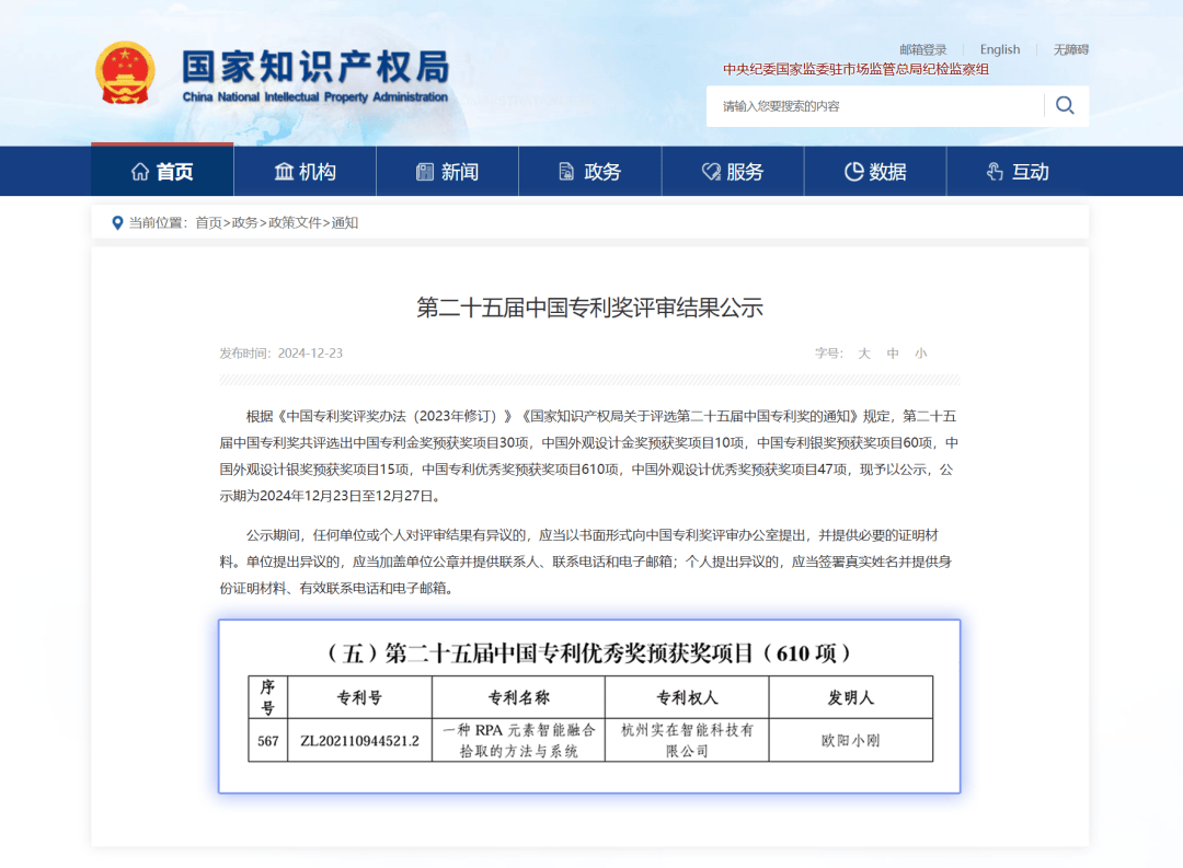 可能有读者会好奇,实在Agent的“双手”为什么这么灵活?尤其是它能“看懂”各种系统界面的能力,到底靠什么技术撑起来?这背后其实有个关键支撑:实在智能的发明专利“一种RPA元素智能融合拾取的方法与系统”(专利号:ZL202110944521.2),刚斩获了第25届中国专利奖。别小看这个奖,它是由国家知识产权局和世界知识产权组织(WIPO)联合主办的,是中国唯一专门奖励专利权的政府奖项,相当于给技术发了“国家级认证证书”,而且业界还是首次有企业凭RPA相关技术拿到这个奖,含金量不用多说。