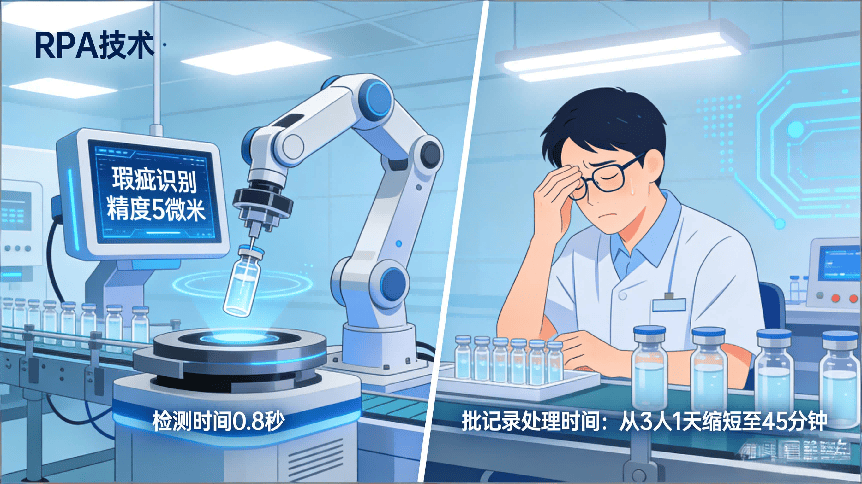 医药生产对合规性和精度的要求近乎苛刻,GMP(药品生产质量管理规范)的每一条规定都容不得半点马虎。但人工操作难免出现失误,比如批记录填写错误、质检漏检等,这些都可能引发严重后果。RPA的“零失误”特性,正好击中了生产环节的痛点。