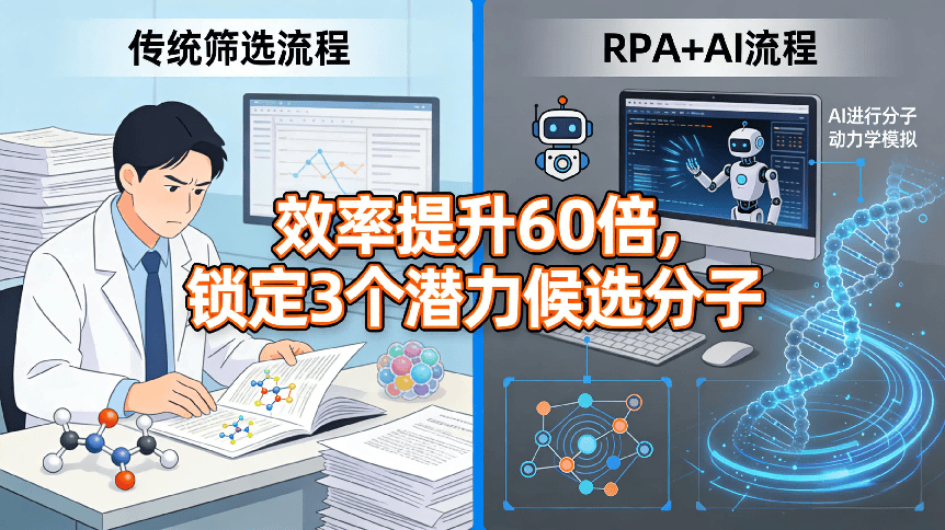 部署DeepSeek+艺赛旗RPA的智能系统后,情况彻底反转。RPA机器人24小时不间断爬取PubMed、CNKI等数据库的文献资料,自动提取化合物分子信息;AI模块则基于这些数据进行分子动力学模拟,快速预测化合物的成药性。最终,这个项目的化合物筛选效率提升了60倍,成功锁定3个潜力候选分子。