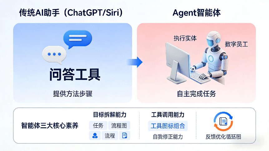 在接触具体产品前,我们得先搞清楚一个核心问题:Agent智能体和我们平时用的ChatGPT、 Siri有什么不一样?简单说,传统AI助手是“问答工具”,而Agent智能体是“执行实体”——前者给你方法,后者帮你完成。