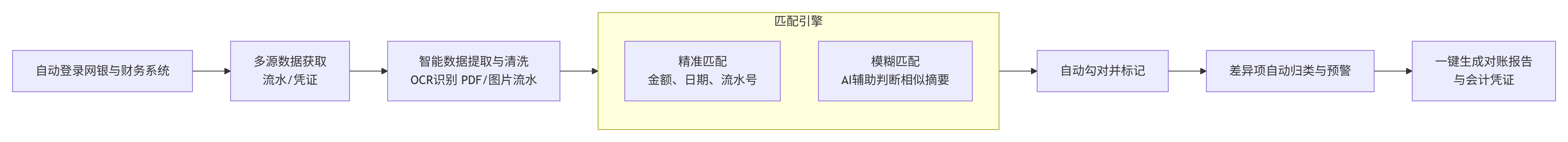 流程优势:全程无需人工干预,7x24小时运行,将对账时长从“人天”压缩至“分钟”,且匹配准确率远超人工。