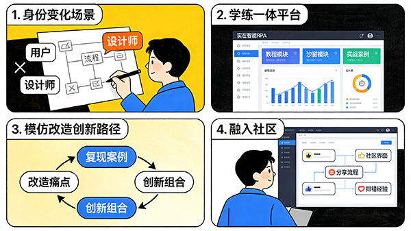 3.遵循“模仿改造创新”路径:从复现一个经典案例(如Excel合并)开始,然后改造它解决自己一个微小的工作痛点,最后尝试创新组合,解决复杂问题。