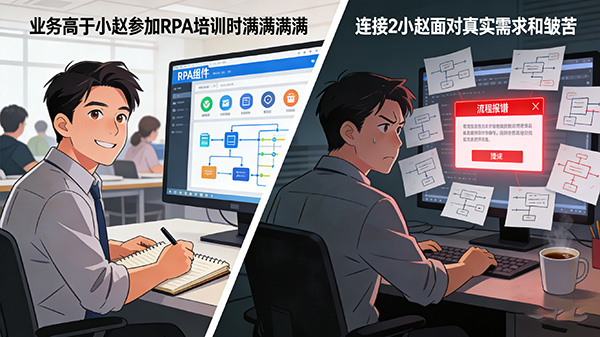 某公司数字化部门的业务骨干小赵,在参加了为期三天的RPA培训后信心满满,但当他面对一个真实的“将每日销售邮件附件自动汇总至ERP”的需求时,却陷入了困境:流程设计得磕磕绊绊,运行时频繁因弹窗报错,最终开发出的机器人脆弱不堪。他疑惑:为何掌握了所有“积木块”(组件),却仍搭不好一座“房子”?