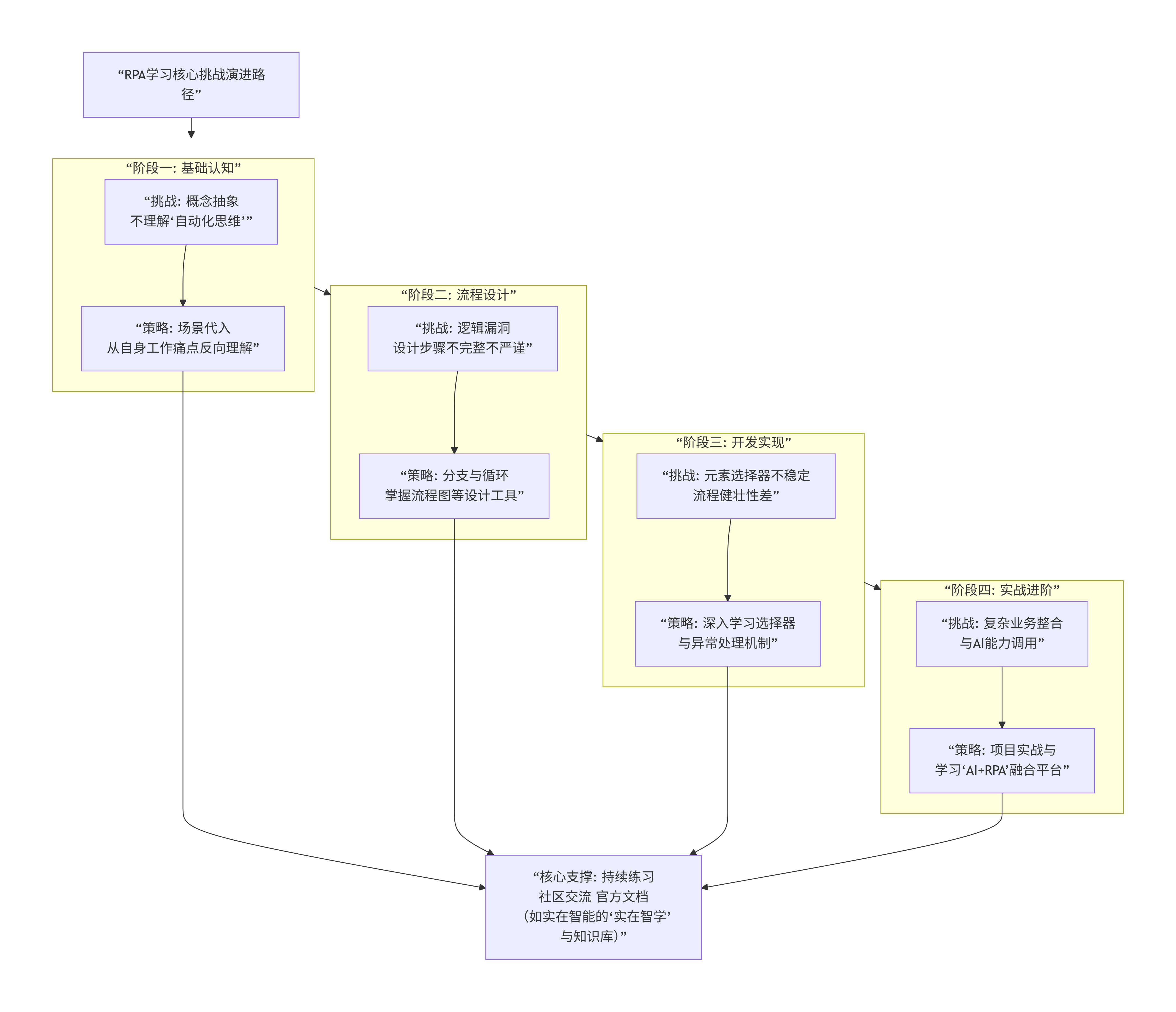 下图系统展示了RPA学习者在四个核心阶段面临的主要挑战,以及跨越这些挑战的关键策略与支撑资源,揭示了从入门到精通的完整路径。