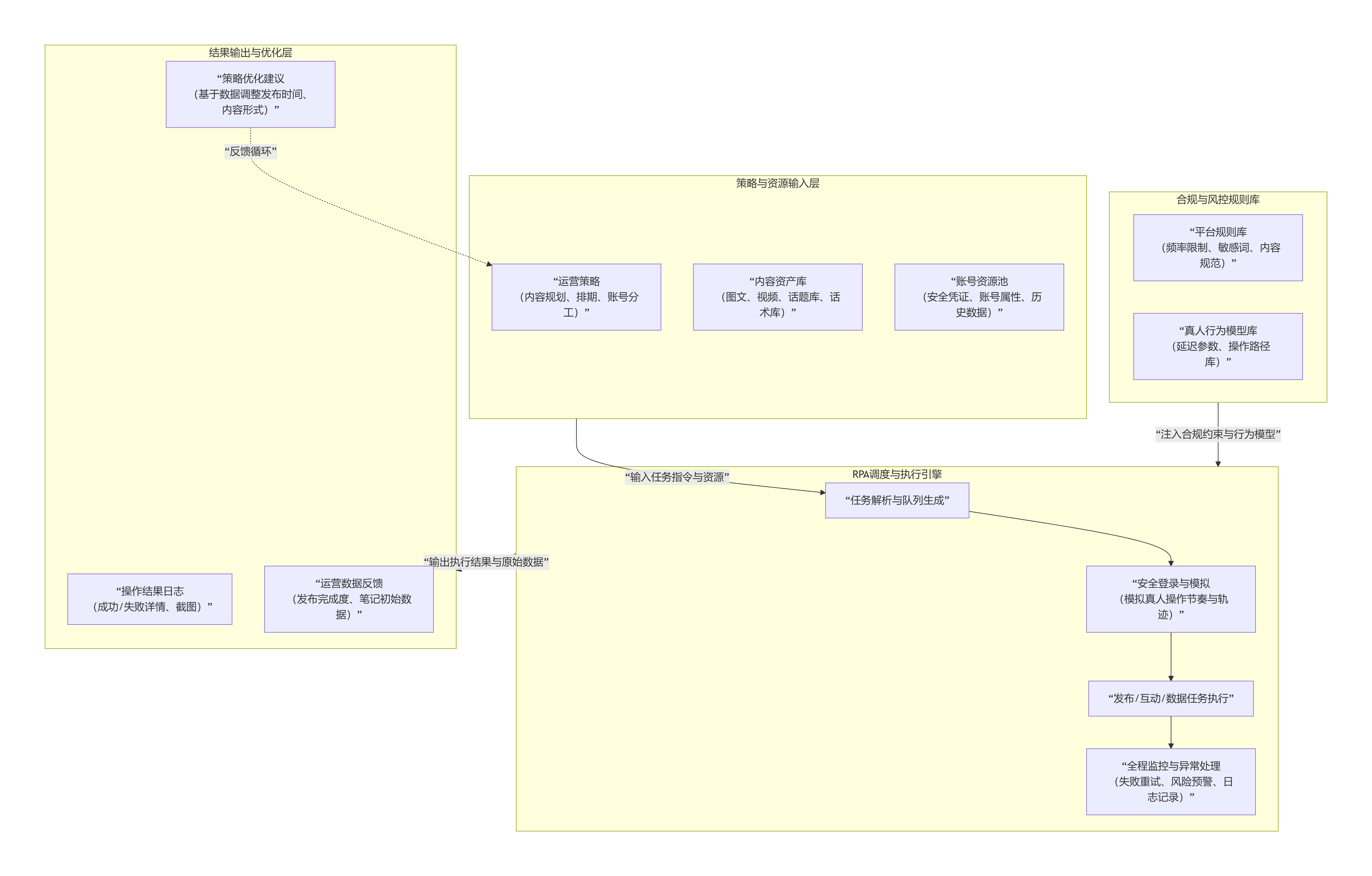 一个完整的小红书RPA系统,其运作并非简单的“按键精灵”,而是一个将运营策略意图转化为安全、可靠平台动作的智能过程。其核心工作流如下图所示: