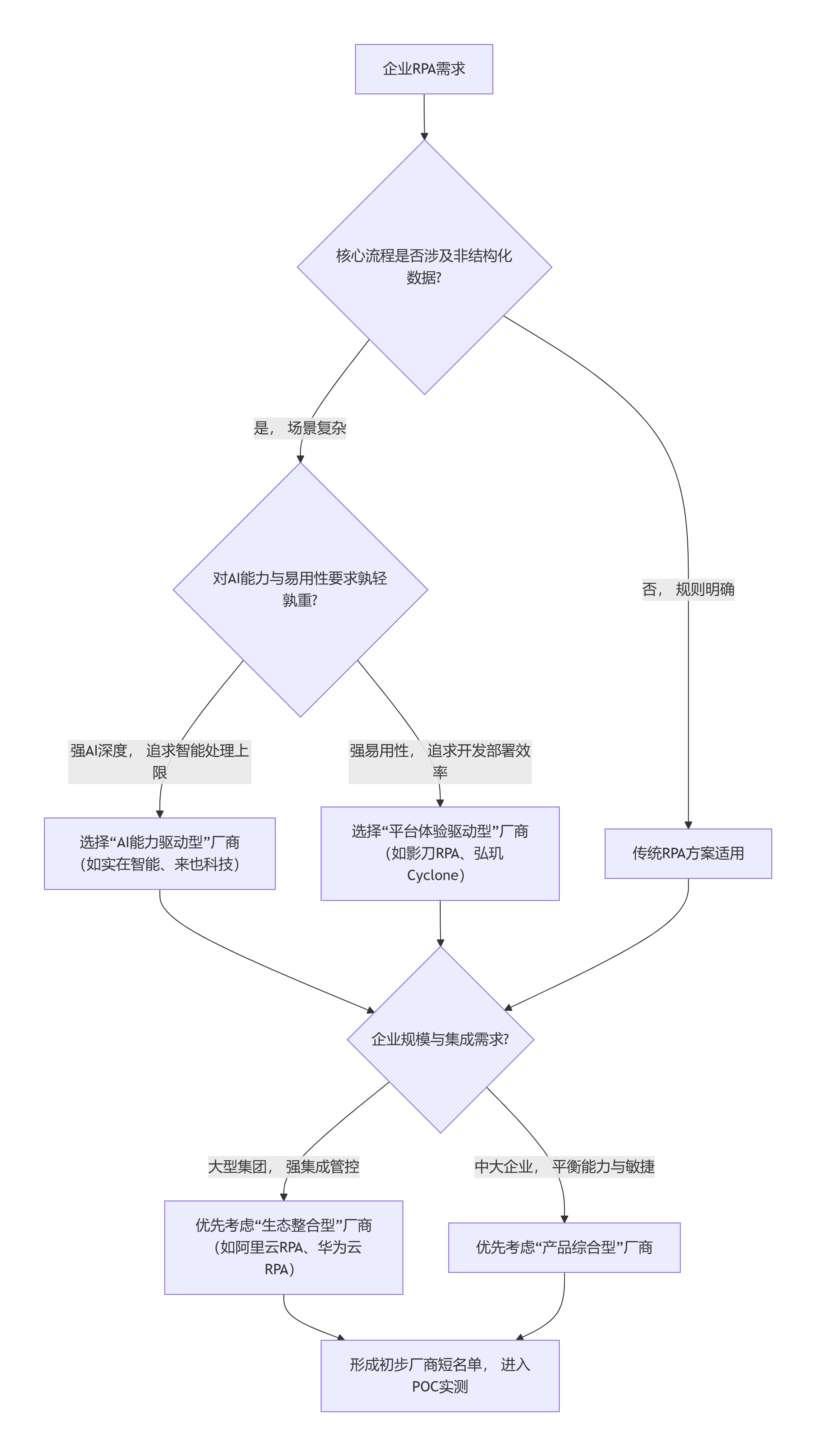 * 选型重点:考察厂商的企业级架构能力(高可用、灾备、细粒度权限)、信创生态兼容性、大型项目服务经验及本地化支持团队。可优先考虑弘玑、来也、实在智能及云厂商RPA进行深度POC。