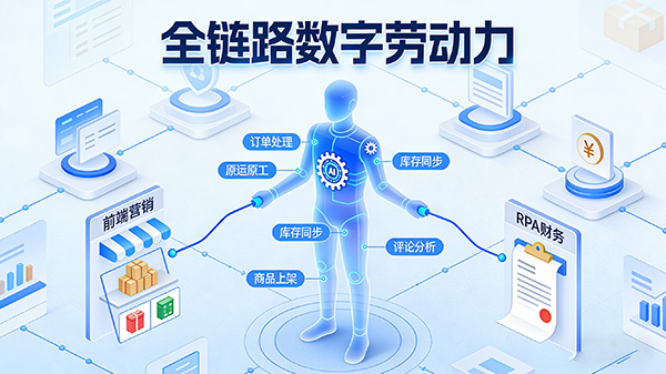 必须打破对RPA的单一认知。在现代电商中,RPA,尤其是融合了AI能力的智能RPA(如实在智能的“实在Agent”),其角色已从执行单一任务的“机械手”,演进为具备一定理解与决策能力的“数字员工”。它通过模拟人工操作,在不改变现有IT系统的前提下,串联起从前端营销到后端财务的全链路断点,实现“AI接管”式的自动化。