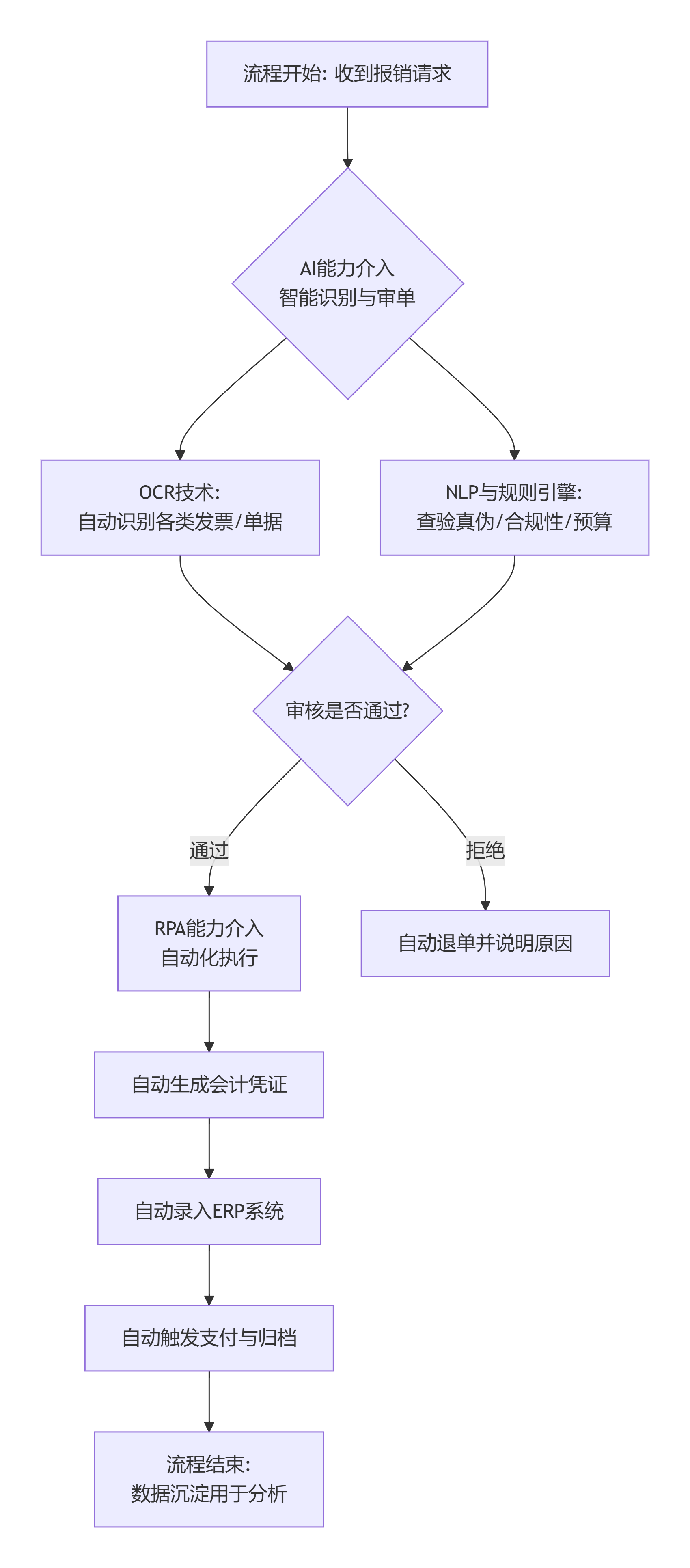 现代财务机器人的价值,已远超简单的“模拟点击”。一个完整的智能财务自动化流程,是RPA“执行力”与AI“认知力”的有机结合。以最常见的“费用报销-入账”场景为例,其运作已形成一条精密流水线: