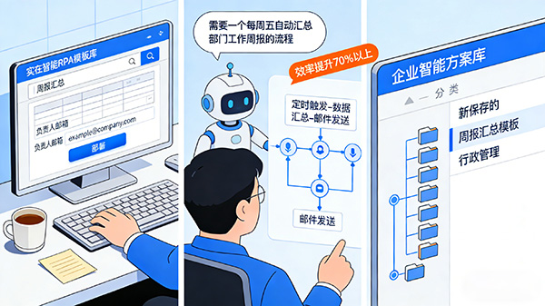 小王的经历是许多初试者的共同痛点。传统RPA开发的确存在学习曲线,其难点在于将业务意图精确“翻译”为机器指令。然而,技术正在颠覆这一局面。以实在智能RPA为代表的新一代平台,正通过“AI+RPA”与场景化模板,将流程搭建从“手工作坊”带入“智能生成”时代。