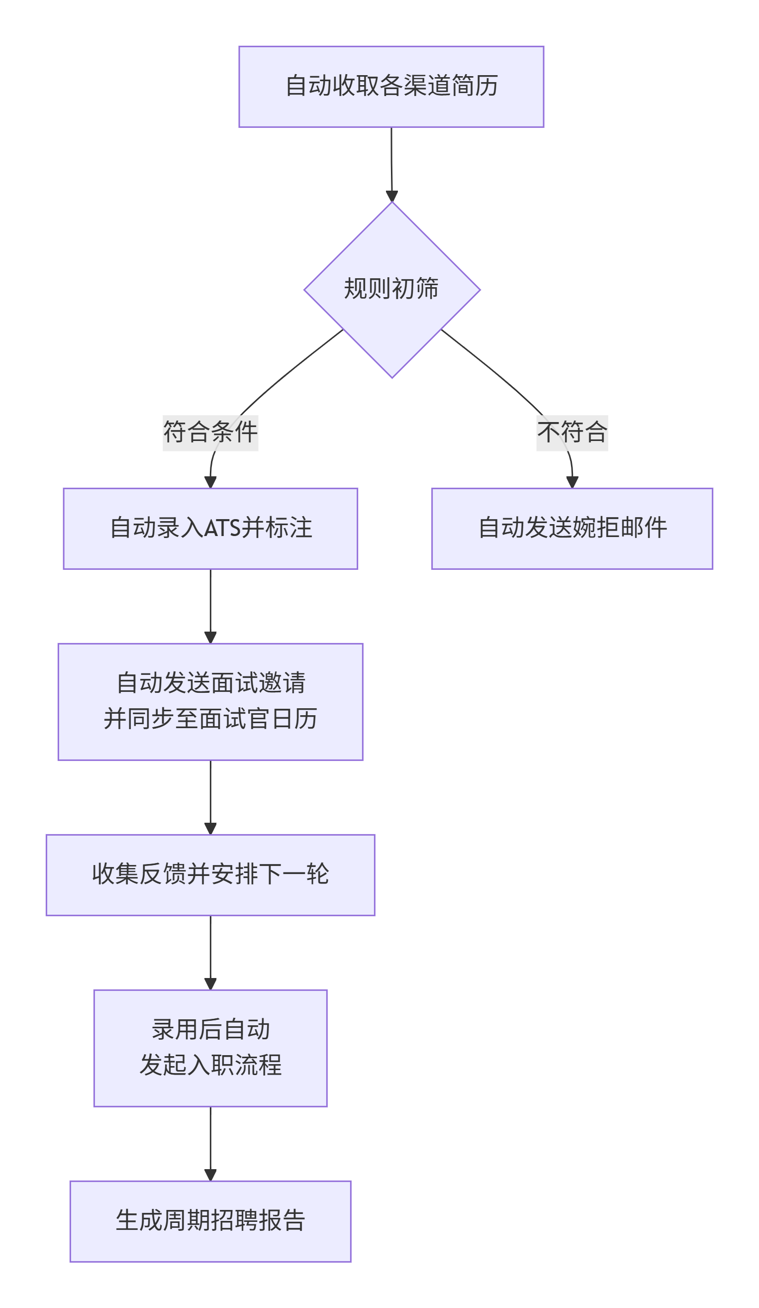 初步筛选与登记:基于预设关键词(如学历、技能、年限)进行简历快速初筛,并将合格者信息自动录入ATS(招聘管理系统)。