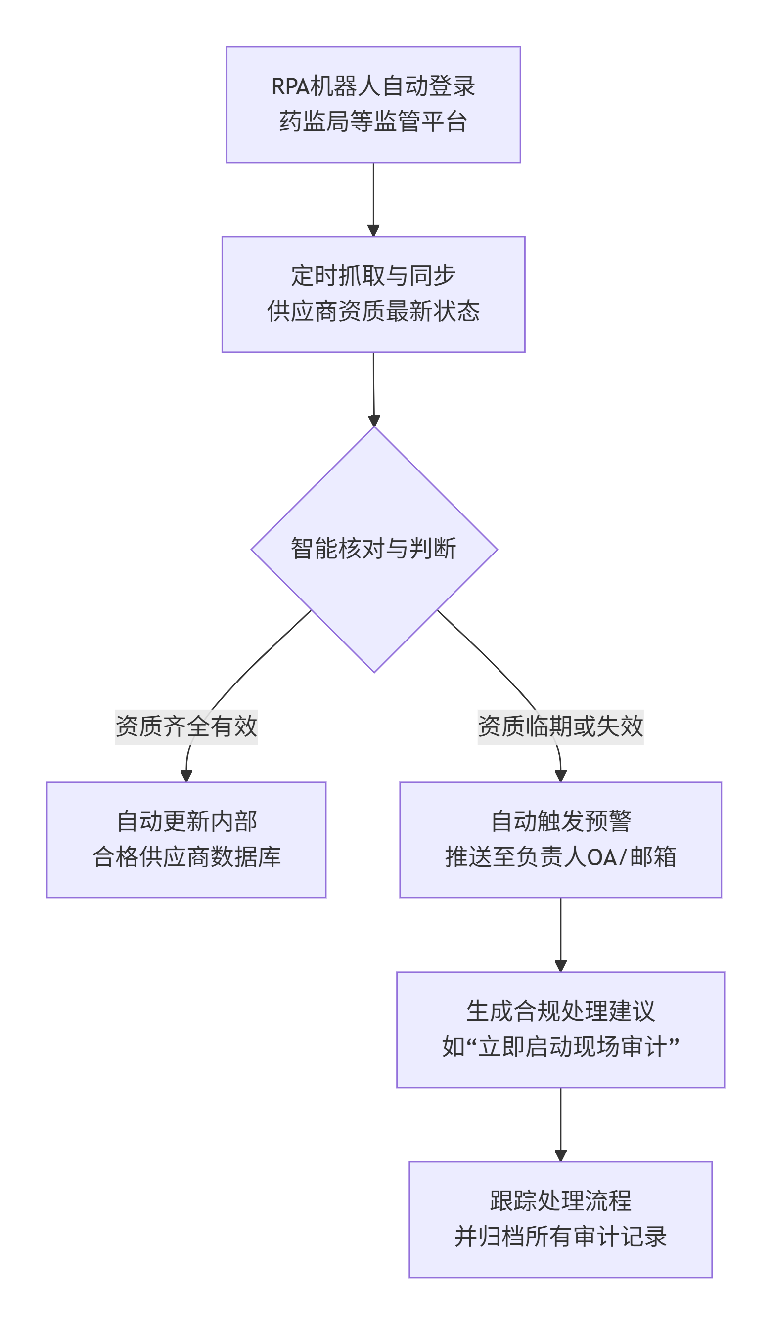 此流程中,实在RPA不仅完成了跨平台的数据同步,更通过集成OCR(识别证照信息)与NLP(理解监管条文)能力,实现了从数据感知、风险预警到行动建议的全流程自动化,将质量管理人员从繁琐的核对工作中解放,专注于高价值的决策与风险处置。